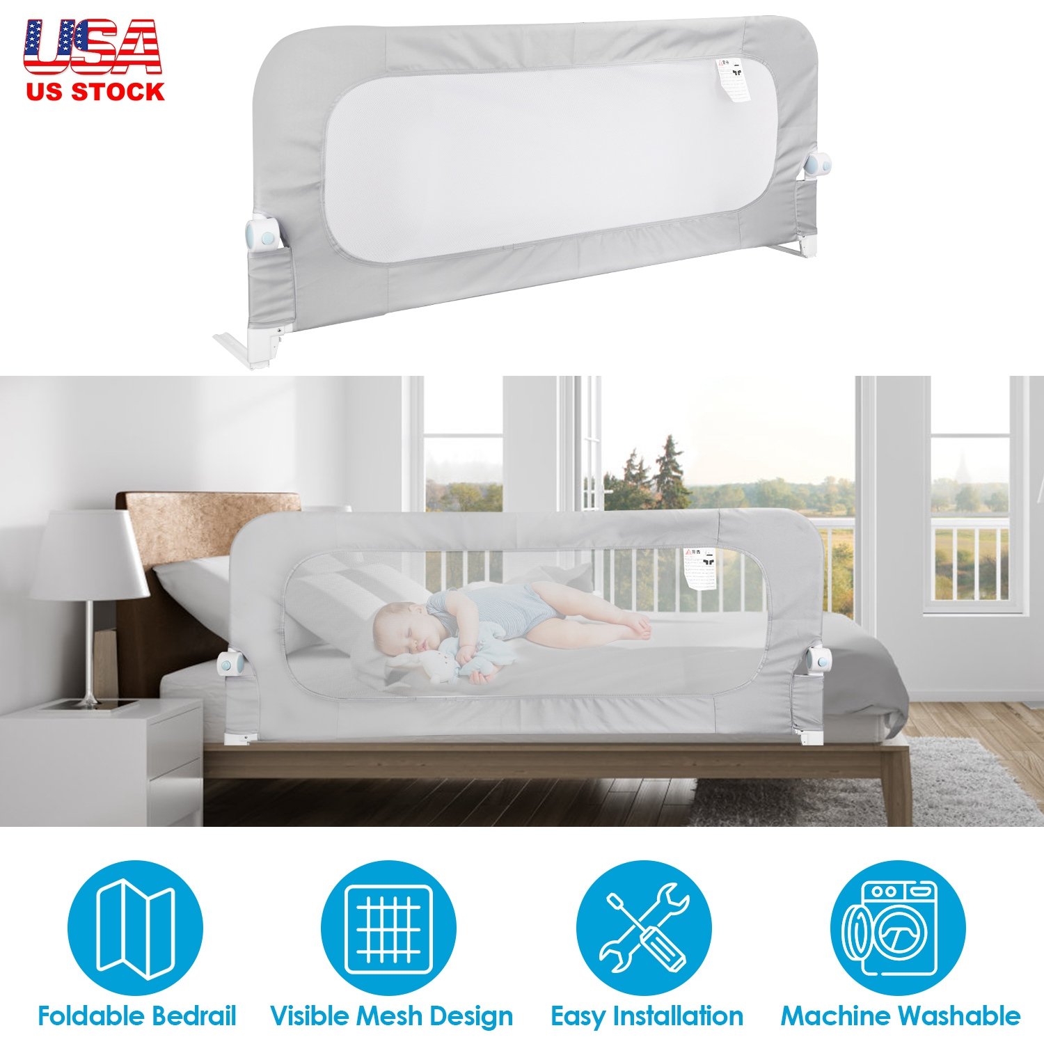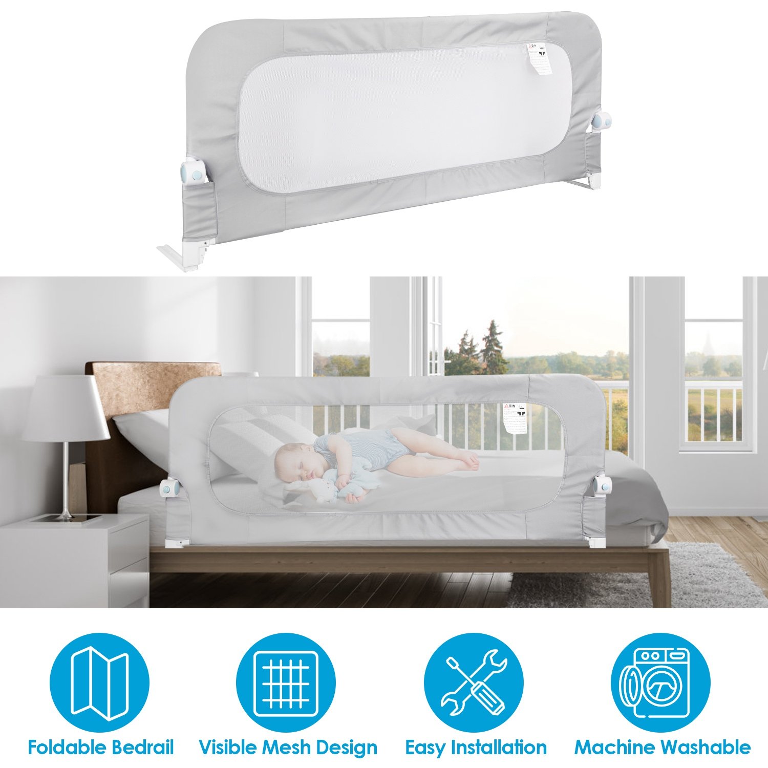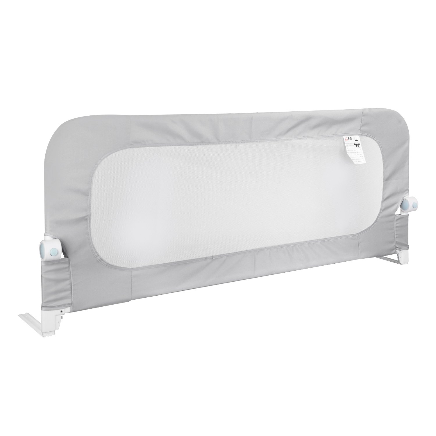 Worrying about accidently flipping over or climbing out of the bed when you overlook? Our 57.48in extra-long toddler bedrail guard is the ultimate solution to ensure your child's safety and give you peace of mind. Constructed with a sturdy and durable iron frame, ensuring reliability and durability. And odorless, skin-friendly mesh fabric makes every movement of your baby visible. With just one click of a button, you can effortlessly fold down the rail to make getting in and out of bed easier than ever. Easily remove the cloth cover and wash it to keep the bedrail clean and maintain a healthy and hygienic sleeping environment for your kids. Universally compatible with most types of beds.