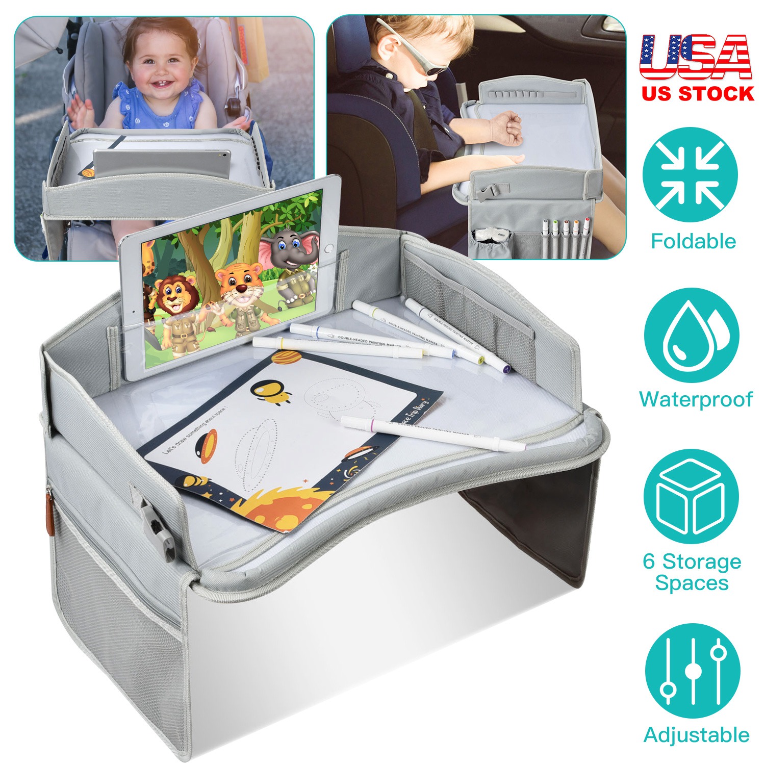 Sometimes you just feel a little annoyed with your vigorous kids on car ride when going for a family trip. Featured with a PVC drawing board and a tablet holder, our kids travel tray allows kids to draw, write, eat munchies, play with toys and watch tablets on it, which gives full play to their imagination and creativity and enables parents to enjoy a quiet and pleasant journey. Comes with 6 storage spaces for tablet, board pens, small toys, snacks, water bottle, books and papers etc.. Constructed out of oxford fabric, PE board and PVC, durable and easy to clean. The safety strap ensures much safety and easy carrying. Designed to fit for various vehicle types like all cars, SUVs, trucks etc.. Collapsible for easy storage. Perfect for car rides, airplane trips, restaurants, picnic, camping, picnic etc.. A meaningful and enjoyable gift for kids!